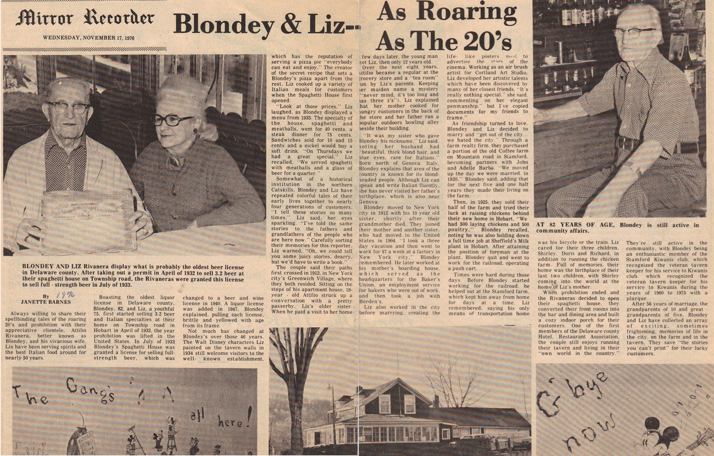 Many of us remember Blondey’s, a former restaurant/bar in Hobart, NY that was very popular. Below is a terrific article written in 1976 about the history of Blondey’s. Click the photo to enlarge.