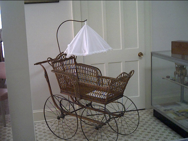 Among the items on display at the Hobart Historical Center is a wicker baby carriage owned by the Rich family in the late 19th century. It was donated by Wallace Rich, whose father and uncle, Wallace H. and Walter Rich, twin sons of Stephen and Mary Hanford Rich, were born in 1894. Included with the gift of the carriage was a copy of the original advertisement for it and other products. (Note: The white silk parasol over the carriage is not the original cover, but was donated by Lynda Turner.)