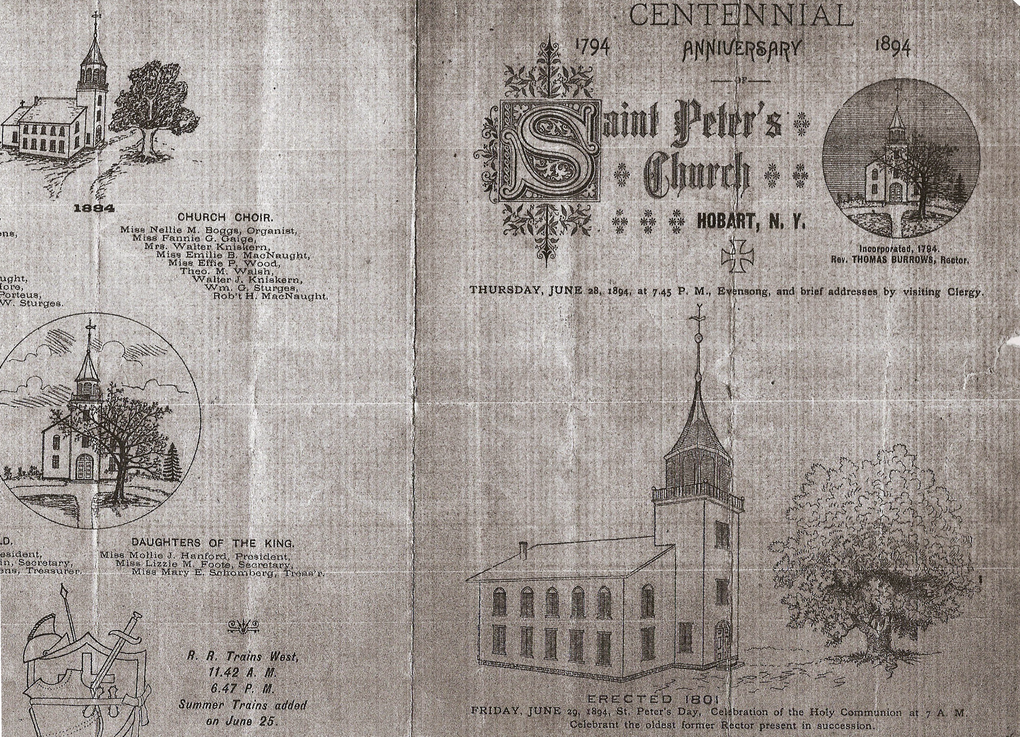 In 1794, the Rev. Walter Clark Gardner, rector of the church in Hudson, took a vacation trip through the Catskills and stopped in what was then known as Watertown, now Hobart. Here on the evening of St. Peter’s Day, June 29, “finding a number of earnest church people, I was persuaded to give a church service at the house of Stephen Barlow, after supper and before sunset. This was the first church service held in their midst,” he wrote. He added, “The people seemed much in earnest and after the service I baptized two children. Next day I spent advising many who were eager to found a congregation and build a house of God.”